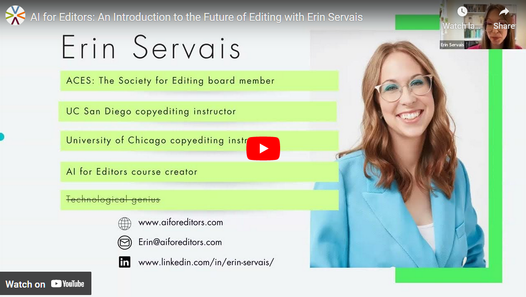 Did you miss our May 13th meeting, AI for Editors with Erin Servais? Never fear, the video is now available! It will be accessible to the public for one month starting from today, and then available only to Guild members from then on.